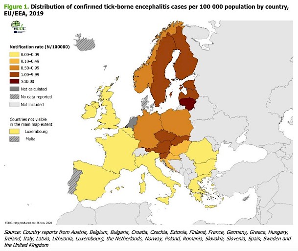 Het European Centre for Disease prevention and Control (ECDC) publiceert jaarlijks een epidemiologisch rapport van het aantal mensen dat TBE oploopt. De rapporten kun je hier bekijken.