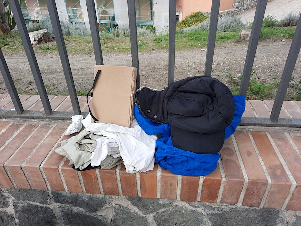 14-10-2021 - nabij Mandanici: Vanacht slaap ik in een schuurtje van een schaapherdersechtpaar. Het werd in de namiddag guur op de berg. De wind stak op en het werd koud. Regenen deed het de hele dag al. In het dorp waar ik naar toe was, Mandanici, had ik toch geen slaapplek. Dus stap ik op de 2 af. Met de vraag of ik kon blijven slapen. Al gauw kreeg ik zelf gestookte wijn, brood, olijven, tomaten en zat er naast de slaapplek ook een avondmaaltijd bij. Ontzettend lieve mensen. In de hoek van de schuur brand een vuurtje daar lig ik vanavond. Laat de wind buiten nu maar waaien in het donker! Het leven is goed.