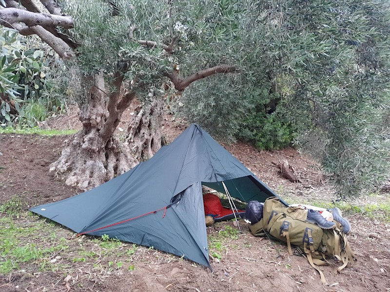 13-10-2021 - Messina: Dit was mijn eerste nacht in de buitenlucht. Heerlijke plek bovenop de berg. Mijn tent mooi weg gestopt tussen de olijfbomen. Het heeft vanacht nog een beetje geregend maar de spullen hebben het gehouden.