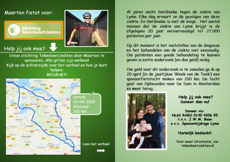 Je kunt meefietsen met Maarten en jezelf laten sponsoren, of je kunt Maarten laten fietsen en hem sponsoren! Je kunt ook het goede voorbeeld volgen en een eigen gesponsorde fietstocht organiseren voor “BIKE4LYME”.